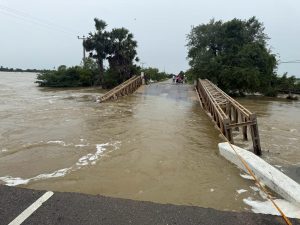 பரந்தன், முல்லைத்தீவு பிரதான வீதியிலுள்ள கண்டாவளைக்கும் புலியம்பொக்கனைக்கும் இடையிலுள்ள பதினொராம் கட்டைப்பாலம் வெள்ளத்தால் பாதிக்கப்பட்ட நிலையில் நிலத்தில் விழுந்துள்ளது.